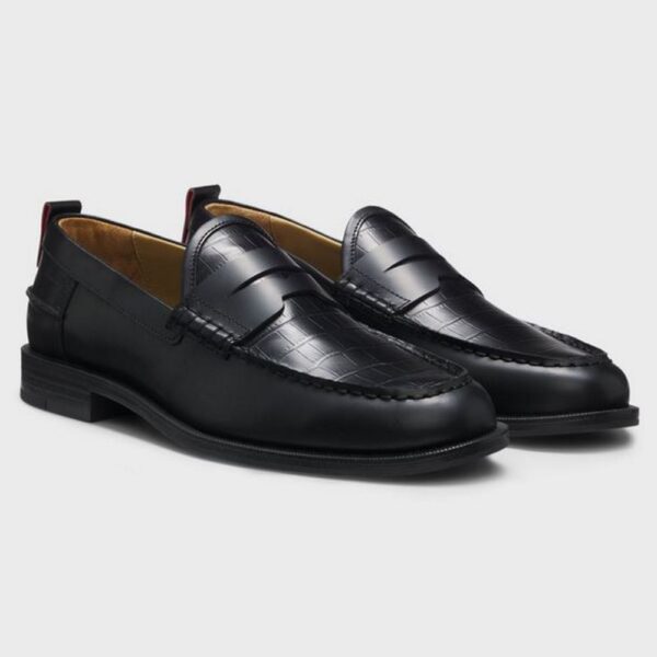 HUGO MEN’S LEATHER LOAFERS WITH CROCODILE VAMP BLACK