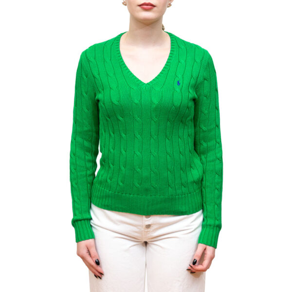 POLO RALPH LAUREN WOMAN CABLE-KNIT COTTON V-NECK JUMPER PREPPY GREEN