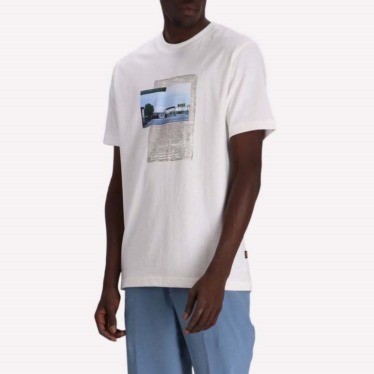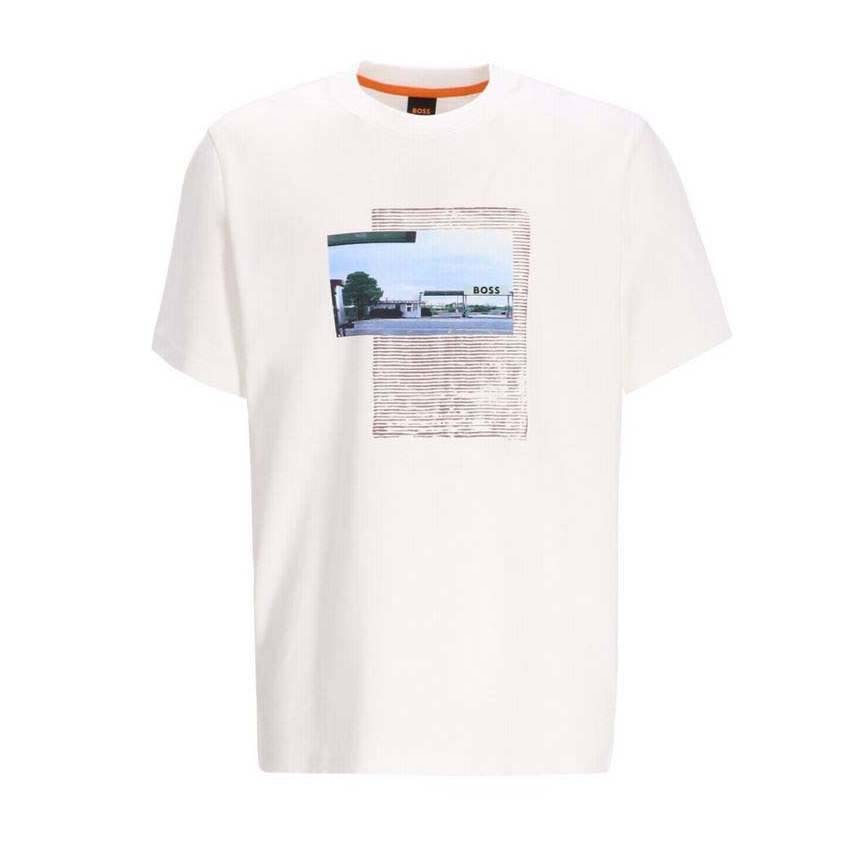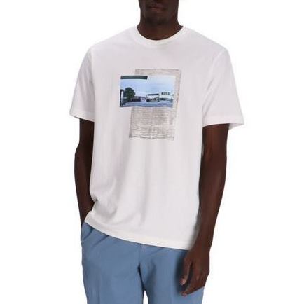 BOSS MEN COTTON JERSEY T-SHIRT WITH PHOTOGRAPHIC ARTWORK PRINT WHITE