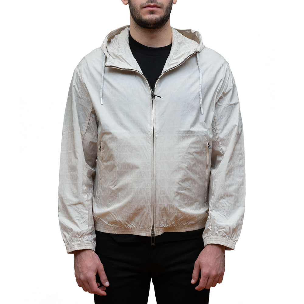 tone-on-tone logo motif. Two-way zip closure, hood