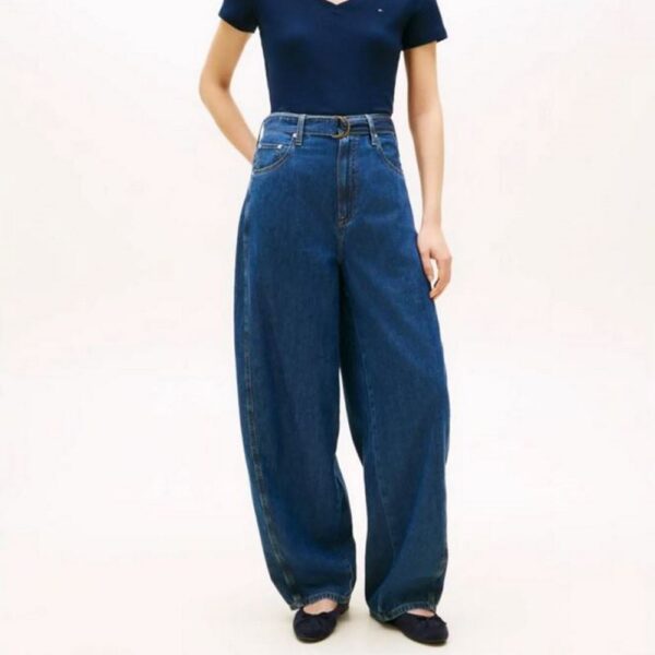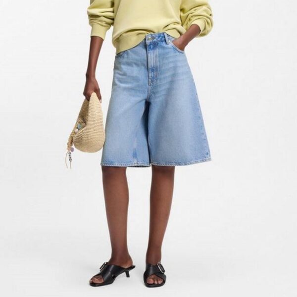 Contrast stitching on stretch cotton in midnight blue, button fastening at waist,
