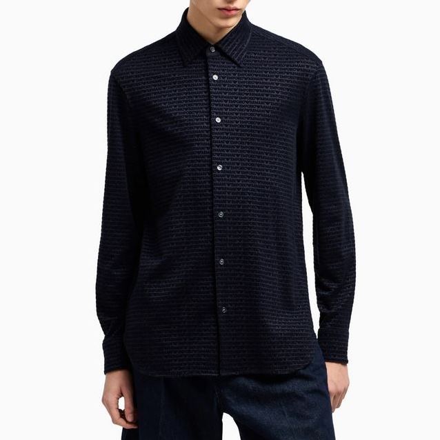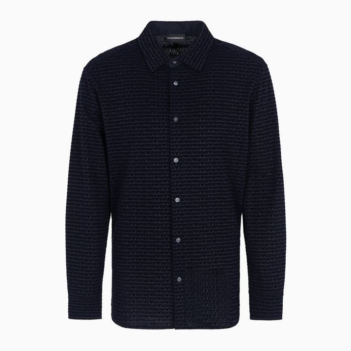 EMPORIO ARMANI MEN ASV LYOCELL-BLEND JERSEY SHIRT WITH ALL-OVER FLOCKED LOGO LETTERING NAVY ALLOVE