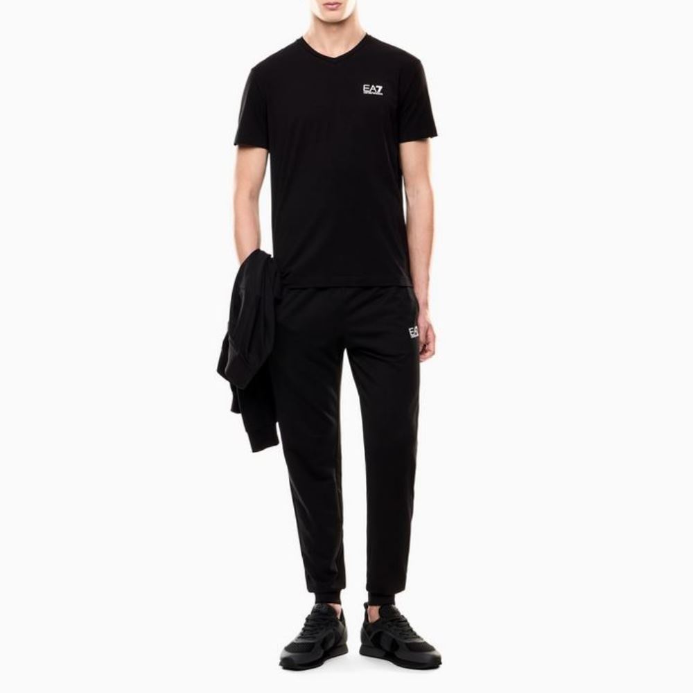 Short-sleeved, stretch-cotton jersey V-neck T-shirt with a minimalist look, perfect for completing various outfits, whether athletic or casual. Can be paired with the collection’s joggers or leggings for a complete look featuring comfort and EA7 style.