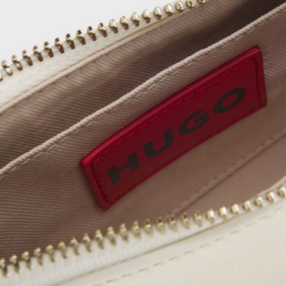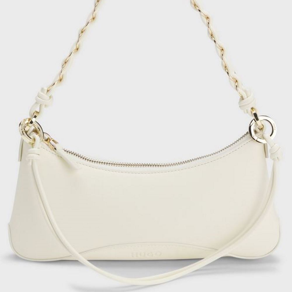This HUGO Womenswear shoulder bag is crafted in synthetic coated fabric, featuring a detachable strap and one with gold-tone links. Embossed HUGO logo. Synthetic coated fabric, sometimes referred to as faux leather, is a fabric designed to resemble real leather, and/or display a matte, glossy, smooth, or textured, coated appearance.  Measurements: 27 x 3 x 11cm This product contains at least 80% better raw materials. This product is partly created with recycled polyester. We at HUGO BOSS prefer recycled polyester from pre- and post-consumer textile waste and do our best to phase out polyester from PET bottles.