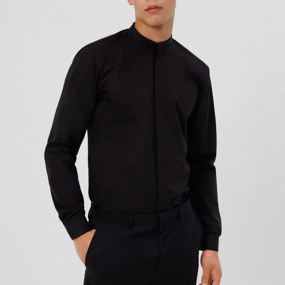 poplin with a stand collar and a concealed closure.