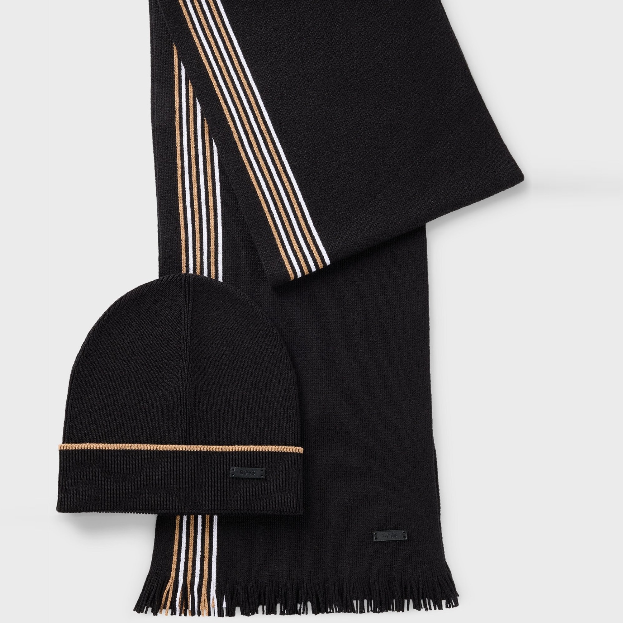 A branded hat and matching raschel-knit scarf by BOSS. Blended with