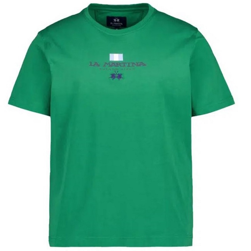 Green cotton T-shirt with a distinctive LA MARTINA logo The striking logo print on the chest gives this classic green instantly recognizable style and sporty authenticity. The pure cotton jersey knit has a comfortably relaxed fit and offers maximum freedom of movement for everyday wear. The regular fit and simple crew neck make this shirt a versatile staple – perfect for casual weekend wear or layering under shirts and jackets. With a back length of approximately 68 cm in size M, the shirt has classic, timeless proportions. For almost four decades, LA MARTINA has combined Argentinian polo spirit with timeless craftsmanship – this T-shirt embodies that philosophy: uncomplicated, high-quality, and for the gentleman who values ​​quality over trends. Our tip: Pair the green shirt with light chinos and white sneakers for a fresh spring look, or wear it under a linen jacket for urban elegance. OUTER FABRIC 100% Cotton Jersey