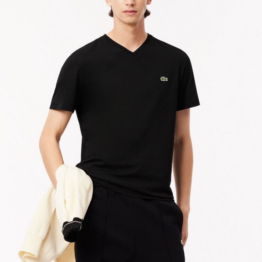 Short-sleeved T-shirt, with V-neck and embroidered Lacoste crocodile logo on the chest.