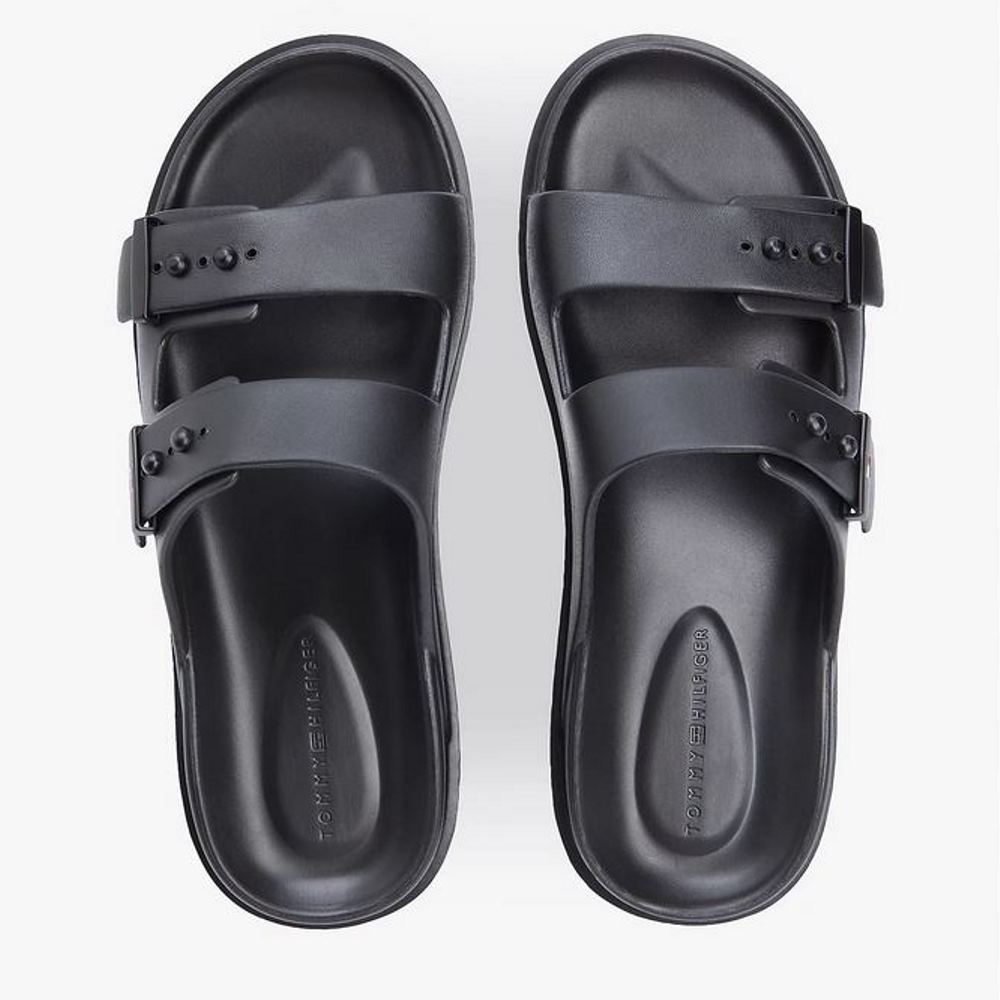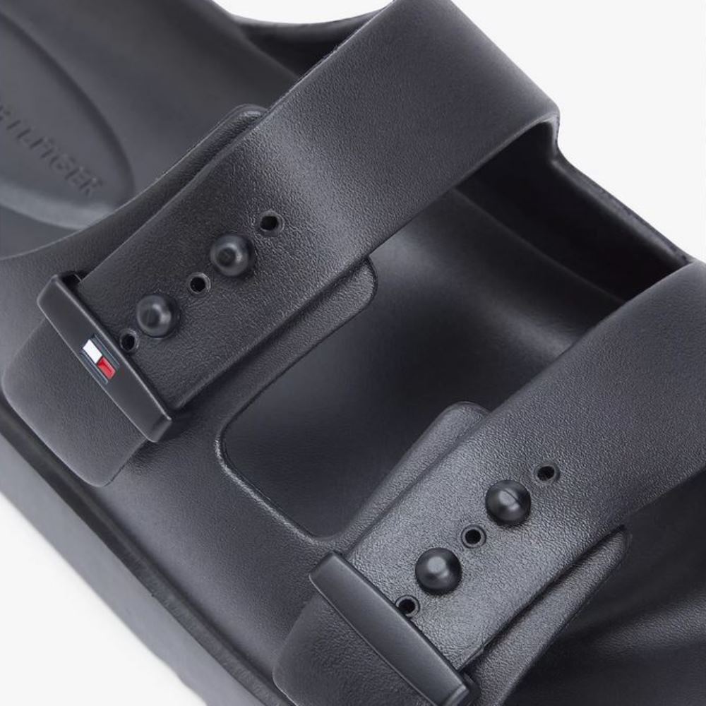 TOMMY HILFIGER MEN LIGHTWEIGHT PIN BUCKLE SERRATED POOL SLIDES BLACK