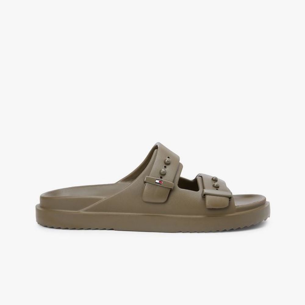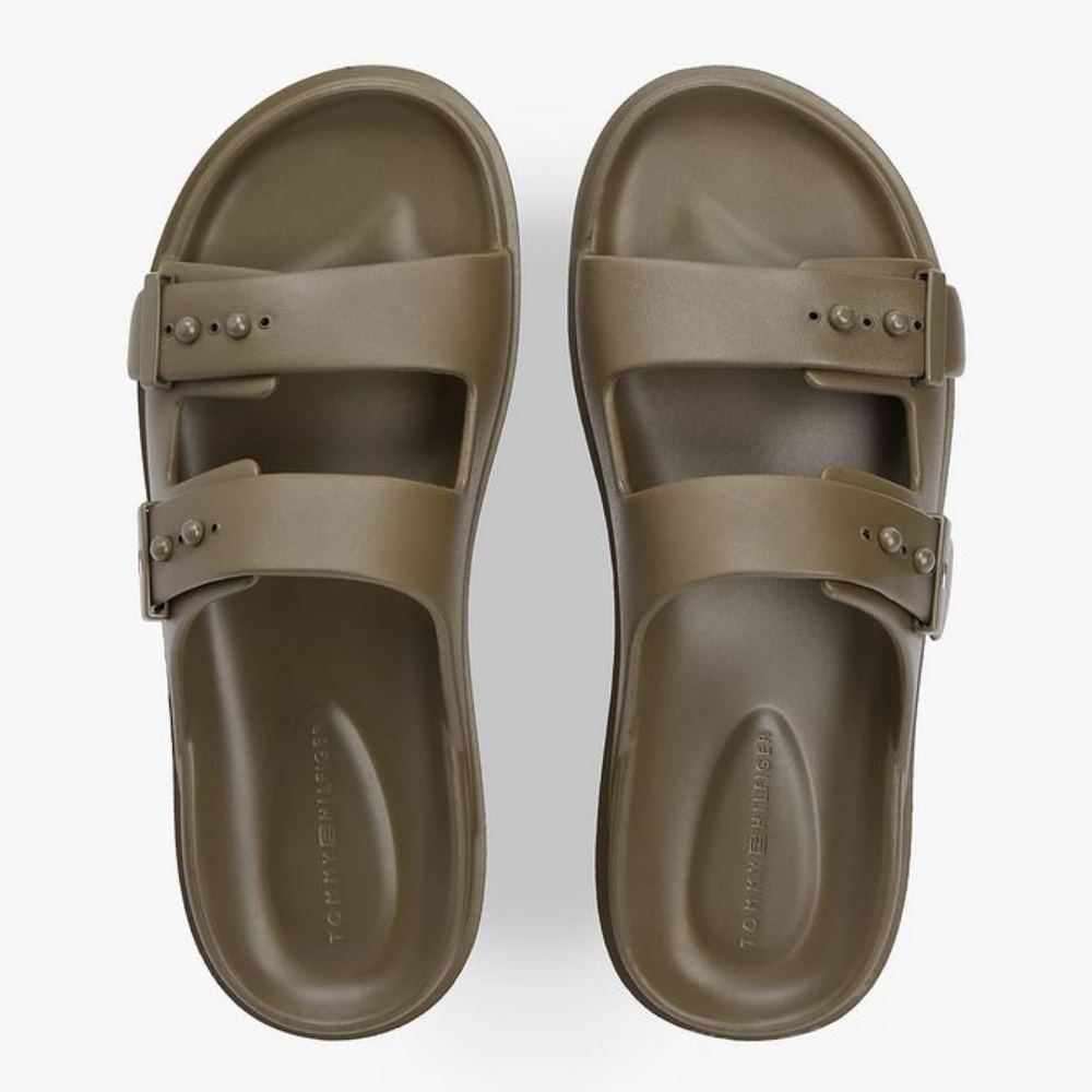 TOMMY HILFIGER MEN LIGHTWEIGHT PIN BUCKLE SERRATED POOL SLIDES WILLOW GREEN