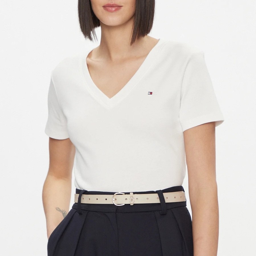 TOMMY HILFIGER WOMAN STRIPE V-NECK SLIM T-SHIRT ECRU