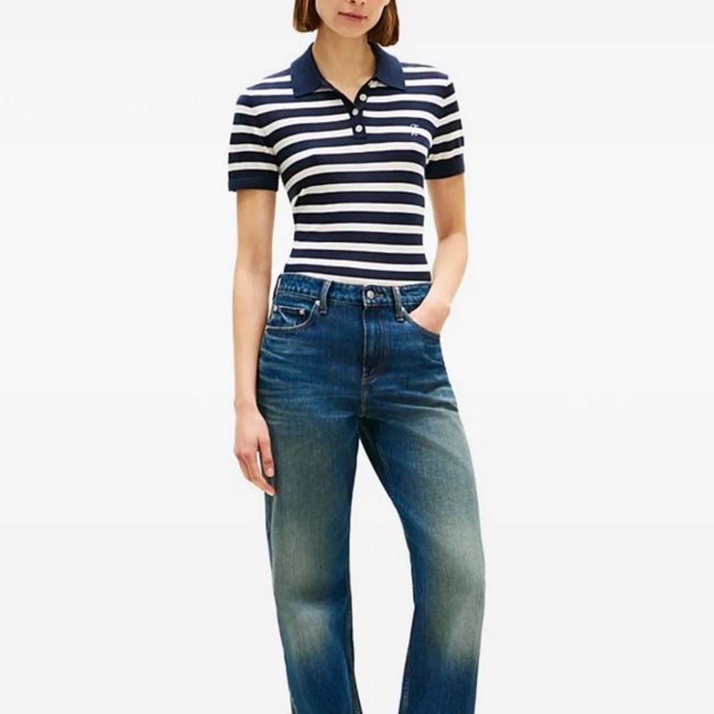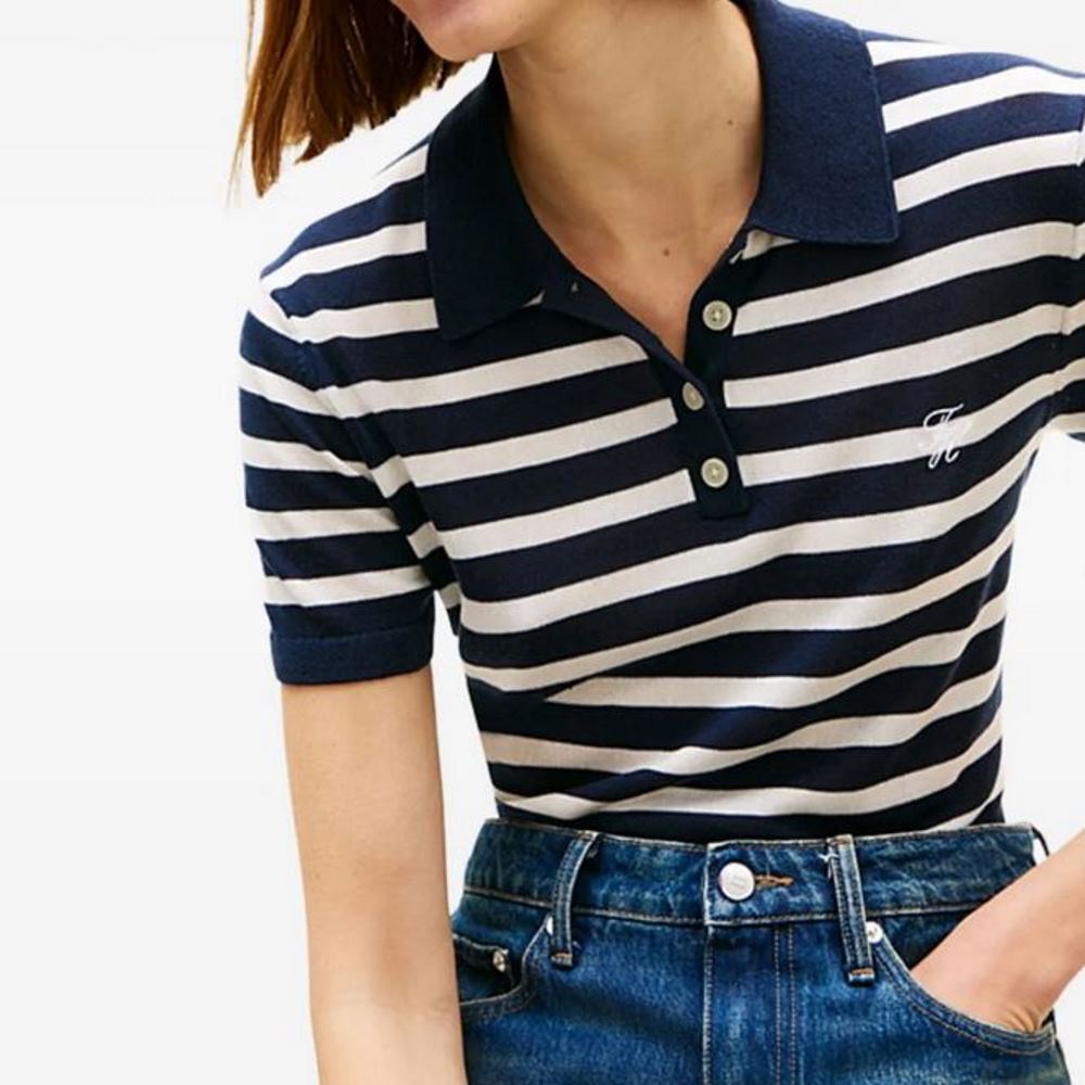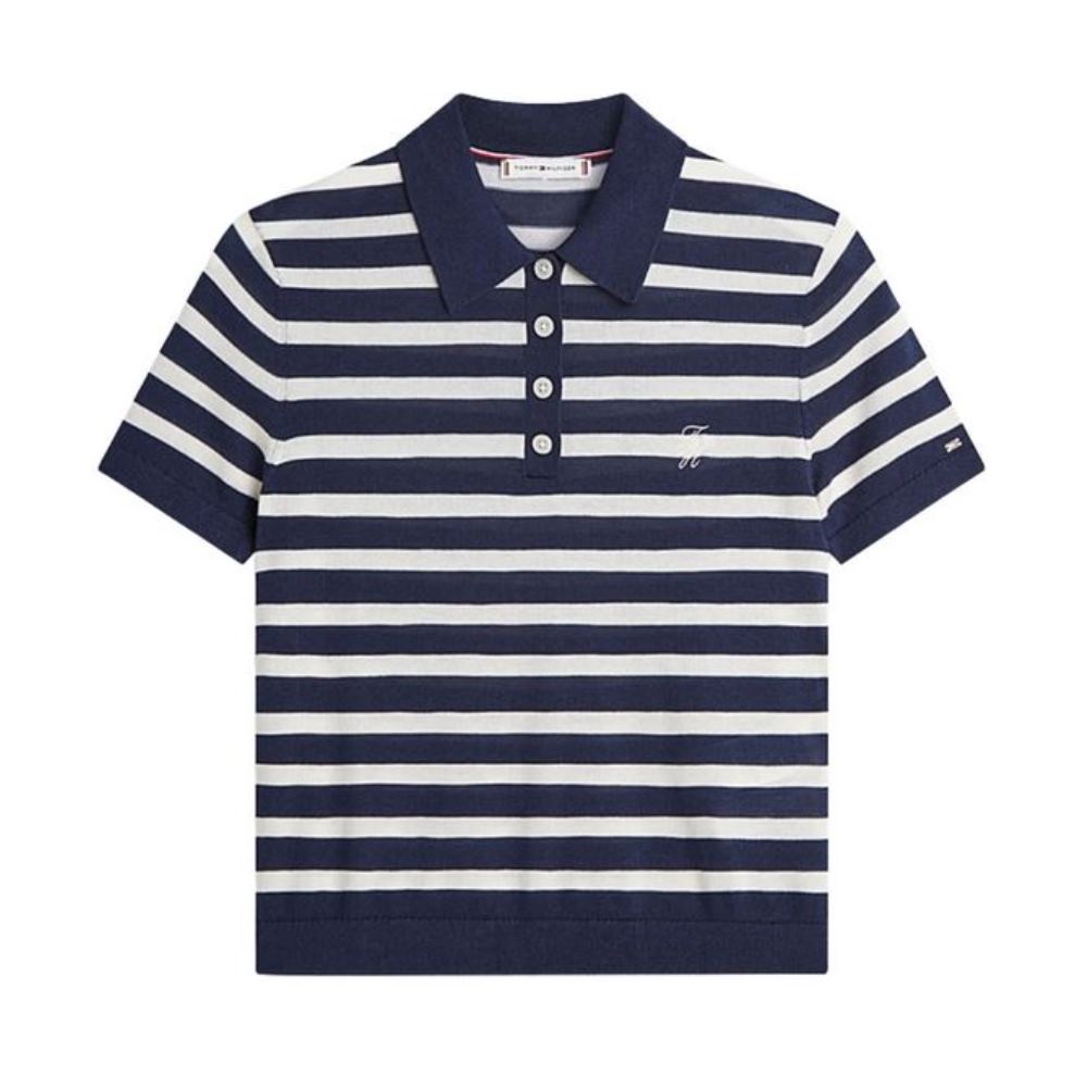 TOMMY HILFIGER WOMAN STRIPED PATTERN POLO TOP BARK NIGHT/ IVORY PETAL