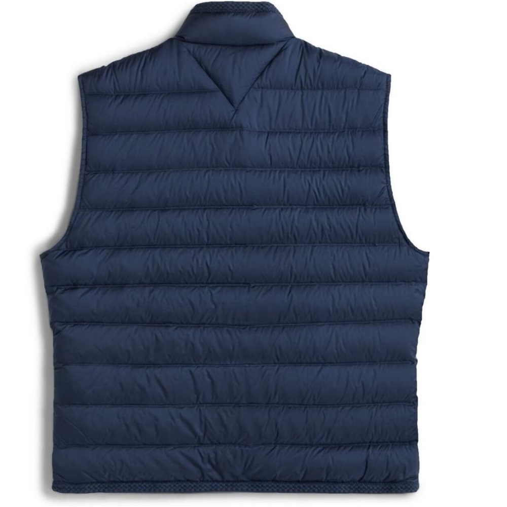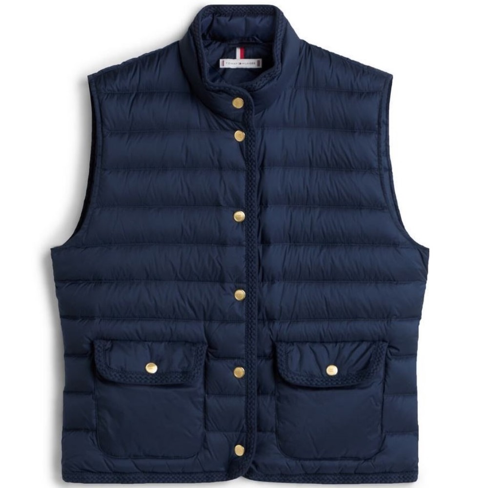 Feminine LW Down Vest by Tommy Hilfiger It has 2 front pockets Closes with gold buttons Tommy Hilfiger logo engraved on the buttons Waterproof & windproof Regular Fit / Normal Line Color: Dark Night Navy / Dark Blue Composition: 100% Recycled Nylon